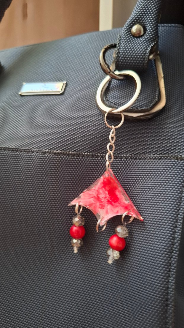 Kırmızı renkte, püsküllü ve renkli boncuklu bohem tarzda kadın anahtarlık. Avant-garde ve retro tarzı sevenler için uygun.