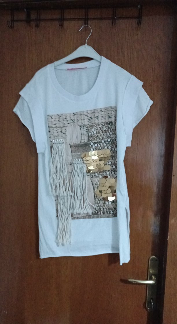 Bohem tarzda, püskül ve baskılı desenli, kısa kollu, bol kesim kadın tişörtü. Yumuşak dokulu kumaştan, yuvarlak yakalı ve kısa boyda, beyaz ve gri tonlarda.