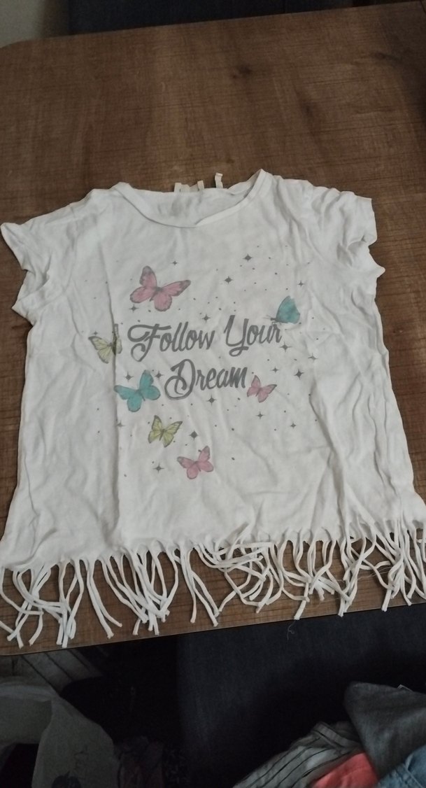 Pamuklu, kısa kollu, yuvarlak yaka, bol kesim kız tişörtü. Püsküllü alt ve pastel tonlarda kelebek baskılı. Üzerinde "Follow Yoin" yazısı bulunur.