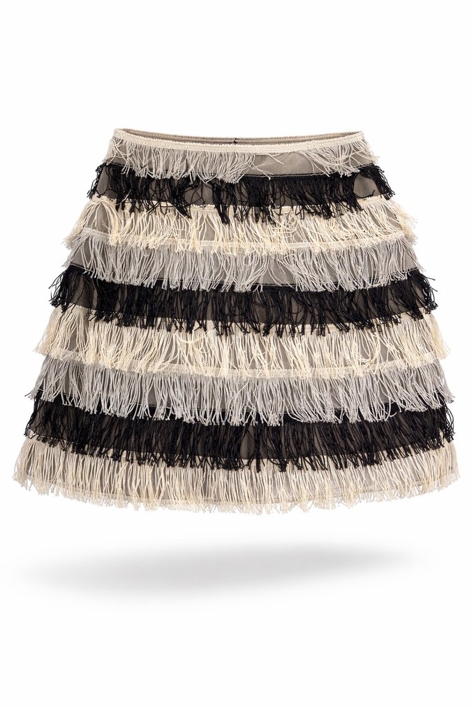 Bej ve gri renklerde, katmanlı püsküller ve nakış detaylı, bohem tarzda, bol kesim mini etek, parti için uygundur.