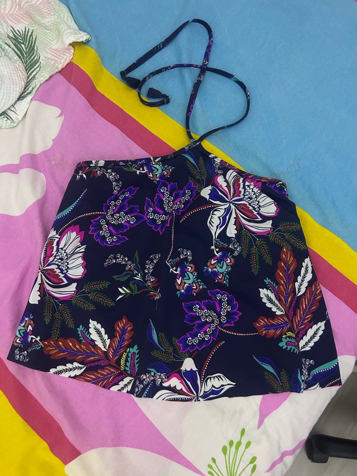 Bohem tarzda, koyu çok renkli batik desenli, boyundan bağlamalı kadın mayo. Bol kesim ve mini boy, dış mekan için uygun.
