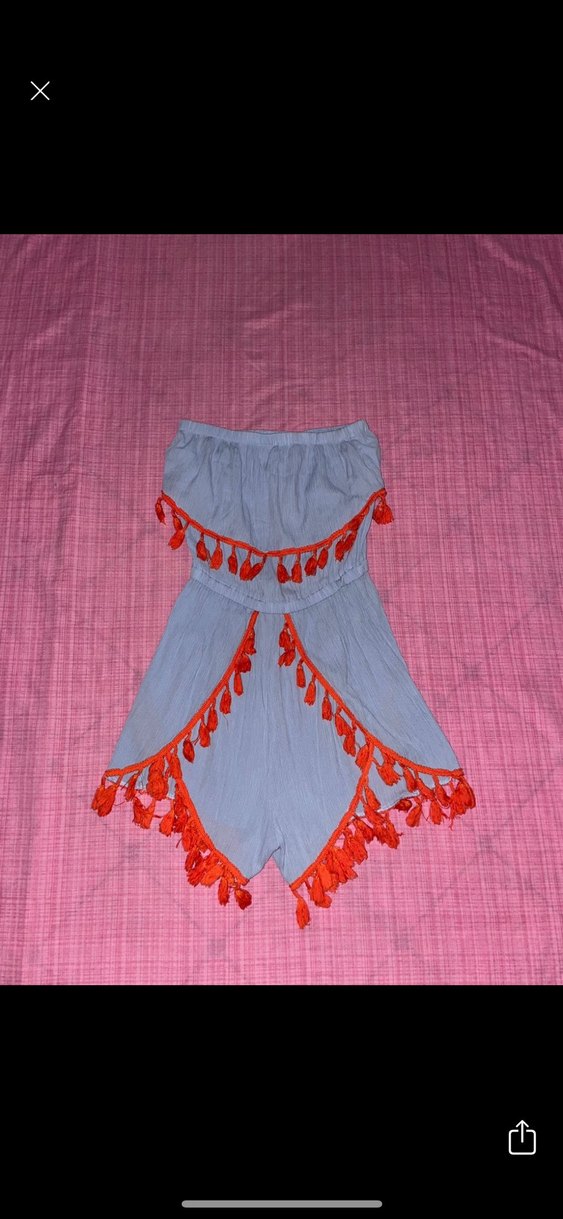 Nakışlı desenler ve canlı turuncu püsküllerle süslenmiş, bol kesim mini straplez tulum. Bohem tarzda parti kıyafeti olarak uygundur.