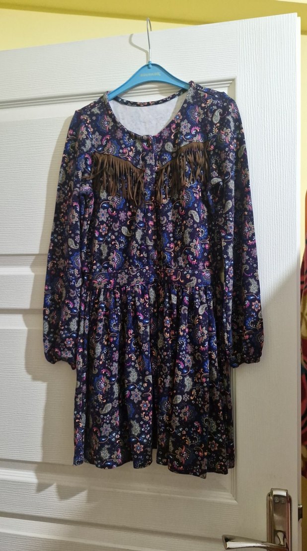 Mor renkli, uzun kollu, yuvarlak yakalı kız çocuk elbisesi. Bohem desenli, püsküllü ve bol kesimdir. Rahat ve şık bir tekstil kumaştan yapılmıştır.