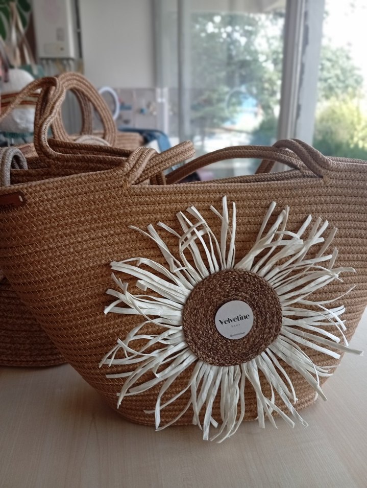 Hafif kahverengi örgü kadın çantası, günlük kullanıma uygun püsküllü baskılı tasarıma sahip, bohem tarzda.