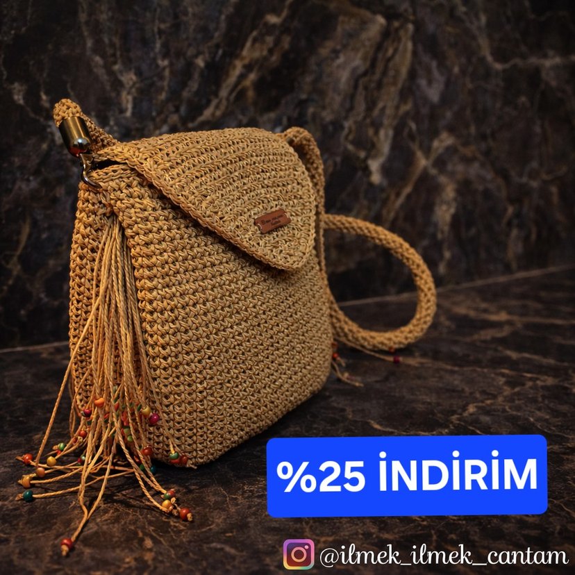 Püsküllü, kahverengi örgü kadın çanta. Bohem tarzda, desensiz ve günlük kullanıma uygun. %25 indirim etiketiyle birlikte.