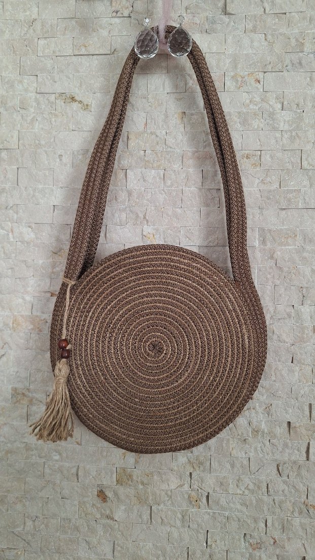 Kahverengi örgü, yuvarlak şekilli ve püsküllü detaylı kadın çanta.kahve tonlarıyla bohem tarzda, günlük kullanıma uygun.