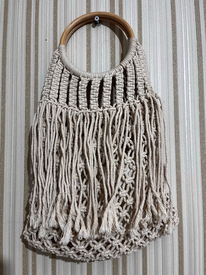 Bej ve gri tonlarında, ahşap saplı, işlemeli püsküllü örgü bohem tarzı kadın çantası.