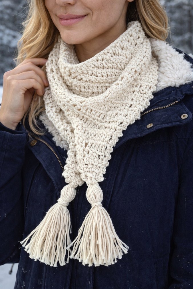 Püsküllü, bohem tarzda, yumuşak ve sıcak dokulu beyaz örgü kadın şal. Trendy günlük kombinlere uyum sağlar.