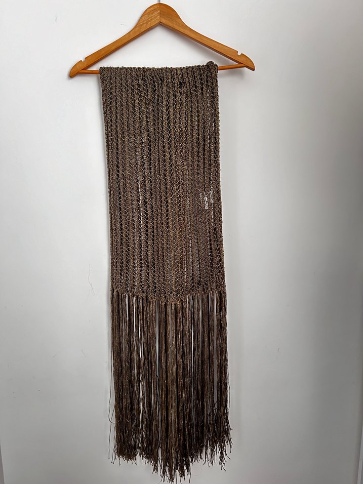 Püsküllü uzun örgü kahverengi kadın pareo, bohem ve retro tarzını yansıtıyor. Haki tonlarla uyumlu, dikkat çekici bir tasarım. Yeni hiç kullanılmadı.