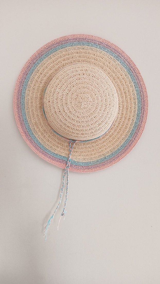 Pastel renklerde, püskül detaylı, örgü kumaştan yapılmış bohem tarzı hasır şapka. Geniş kenarlı ve yumuşak dokulu bir tasarıma sahiptir.
