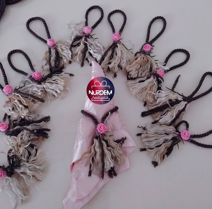 12 adet fiyatıdır. Püsküllü detayları ve pembe gül süsü detaylıdır.