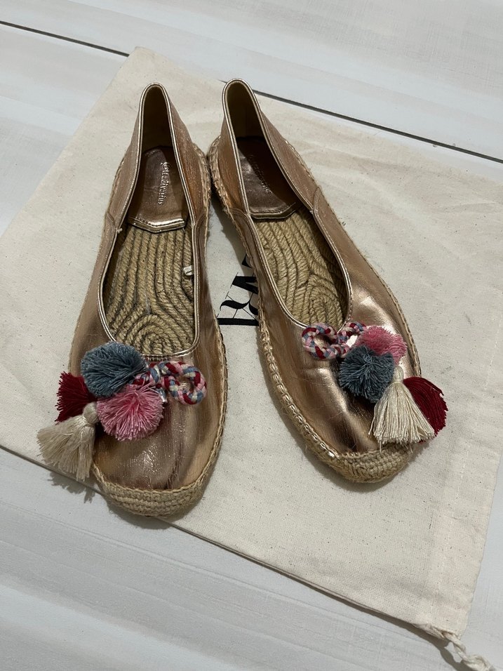 Pembe renkte, dolgu topuklu espadriller. Nakışlı detaylar ve renkli püsküllerle süslenmiş, kauçuk tabanlı günlük kullanıma uygun.