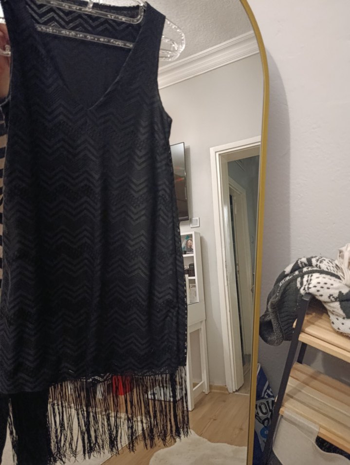V yaka, kolsuz, desenli kumaş ve püskül detaylı, bohem tarzda siyah midi elbise.