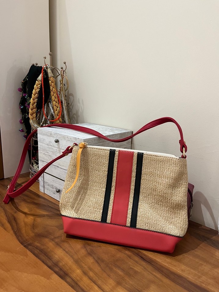 Kadın çantası, renkli baskı ve püskül detayına sahip, sentetik kumaş ve kırmızı dokunuşlarla bohem tarzda trendy bir görünüm sunar. Sadece 1 kere kullandım daha sonra kombinleyemedim tertemiz hasır ve deri detaylı alana hayırlı olsun. İster portföy ister askılı olarak kullanabilirsiniz