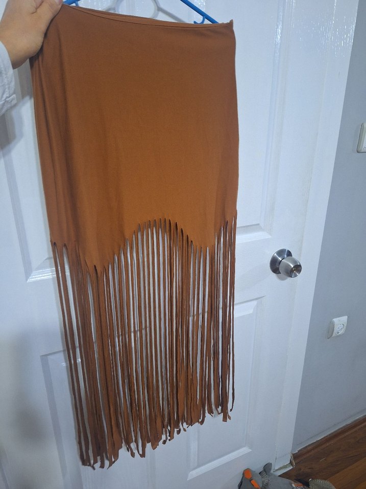 Bej renkli, dökümlü ve uzun püsküllü kadın etek, yumuşak sentetik kumaştan üretilmiştir. Parlak ve bohem tarzıyla retro ve hippie görünüme uygundur. 90 cm uzunluk