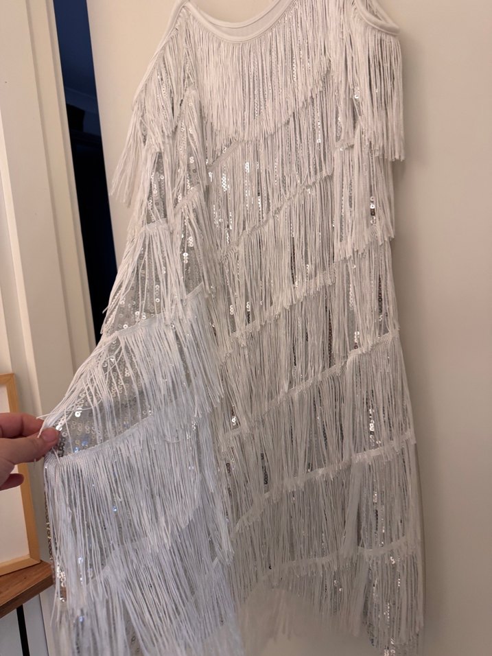 Uzun, beyaz ve bol kesim bu abiye elbise, askılı kollara, işlemeli detaylara ve akan püsküllere sahip, bohem parti tarzı için uygun. ✨