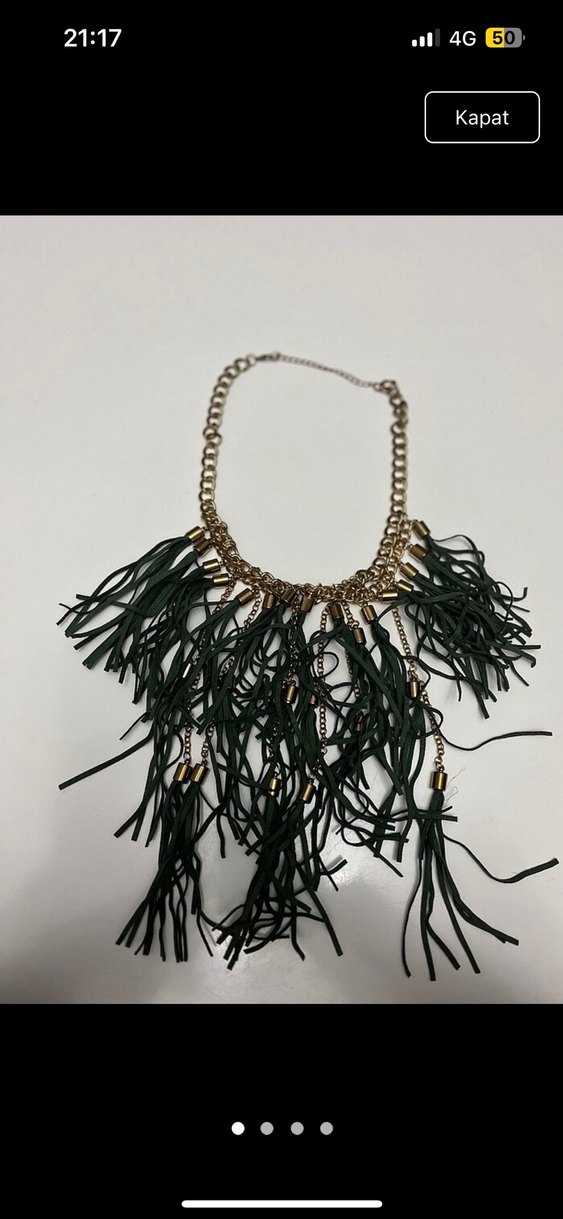 Uzun boyda, koyu yeşil püsküllere ve yılan desenine sahip kadın kolyesi. Bohem, hippie ve retro tarzlar için uygun, partiye yakışır.