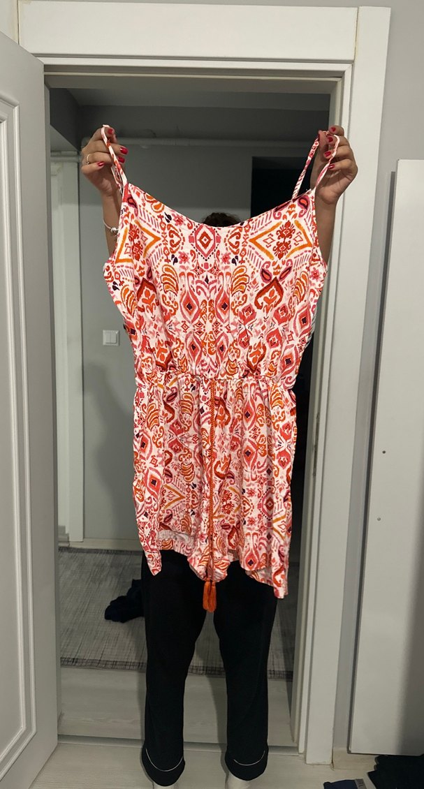 Renkli, hafif tie-dye desenli, V yakalı ve püsküllü, bol kesim askılı şort tulum, sentetik kumaştan, günlük kullanım için uygun.