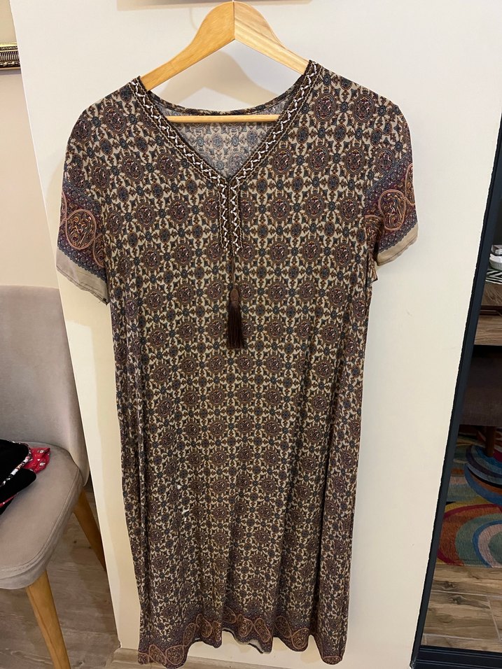 Kahverengi uzun elbise, bol kesim, kısa kollu ve V yakalıdır. Bohem tarzda tie-dye desen ve püskül detaylarına sahiptir. Yazlık kısa kollu otantik elbise tiril tiril fotoğrafta görüldüğü gibi ön kısımda belli belirsiz bir renk açılması var bir sefer giydim boyu 113 cm koltuk altı 106cm bel 112 cm kol boyu 17 cm