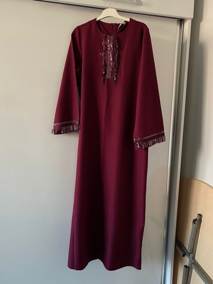 Bordo renkli, uzun kollu, yuvarlak yakalı kadın elbisesi, ön ve kol uçlarında püsküllü nakış detaylarına sahip. Bol kesim ve parlak görünümlü, bohem tarzı için uygun.