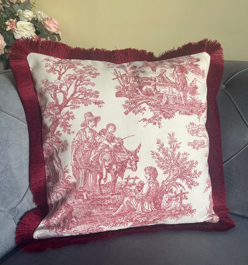 43/43cm ebatında Bordo renkli, renkli desenli klasik tarzda, püsküllü kenarlara sahip kırlent. ️