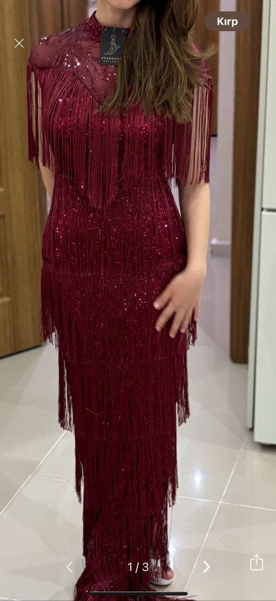 Püsküllü, V yakalı ve askılı bordo uzun abiye elbise. Parlak nakış detayları ve püskülleriyle göz alıcı bir parti kıyafeti. ✨