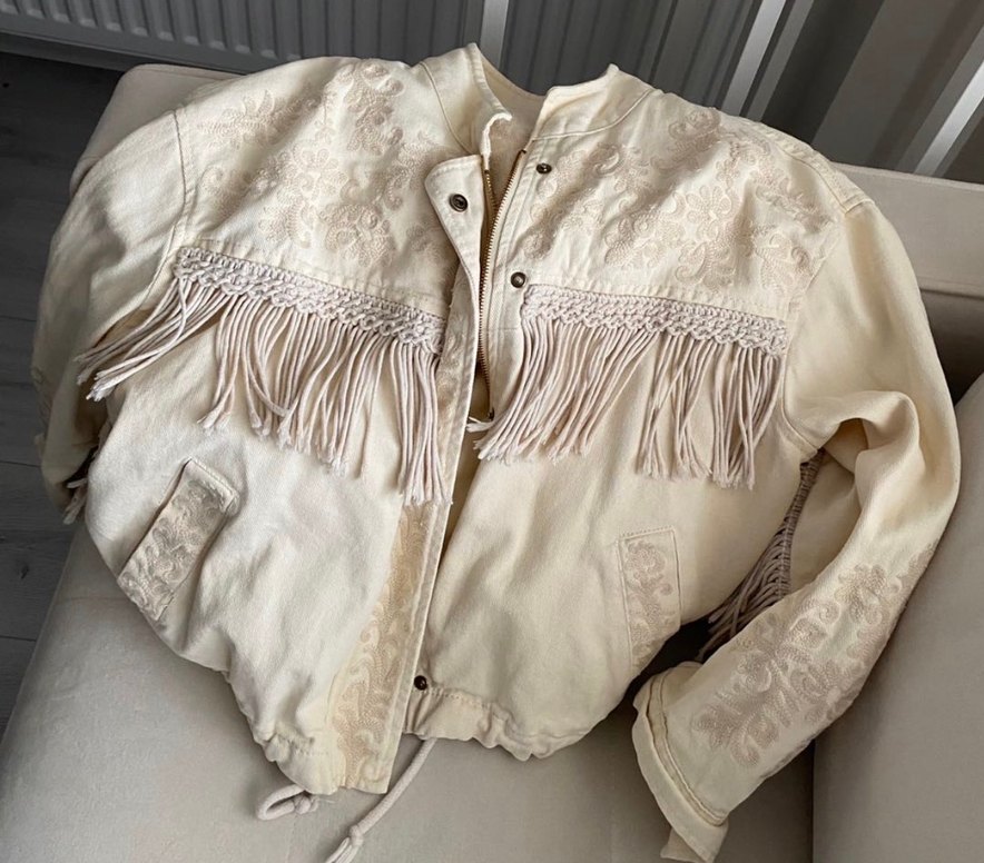 Nakışlı ve püsküllü krem ceket, bol kesim ve düğmeli kapama ile. Notlu yaka ve uzun kollu, bohem tarz için uygun.
