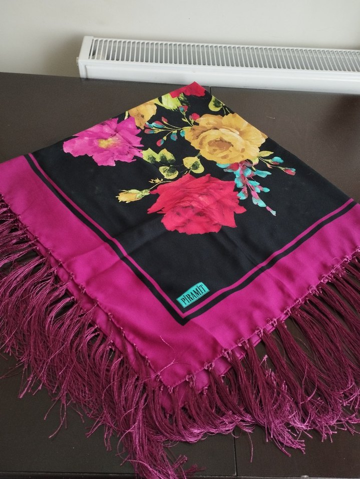 İpek dokulu, çok renkli çiçek desenli ve püsküllü kenarlarıyla bohem tarzda kadın eşarp
