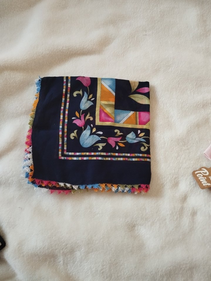 Püsküllü kenarları ve çok renkli koyu tonlarıyla bohem tarzda kadın fularıdır. iğne oyası