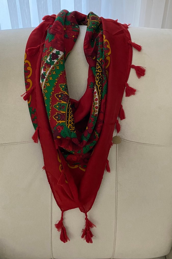 Püsküllü, çok renkli tekstil kadın şalı, bohem tarzı desenlere sahip. Retro ve hippie havası katar.