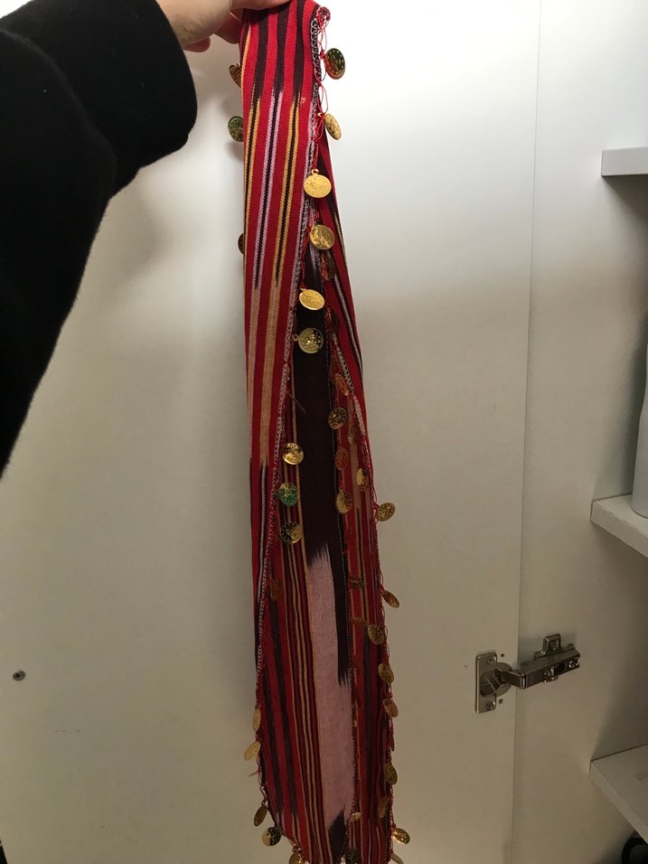 Bu kadın şalı, püsküller ve madeni para şeklinde süslemelerle bohem tarzını yansıtan koyu çok renkli tekstilden yapılmıştır.