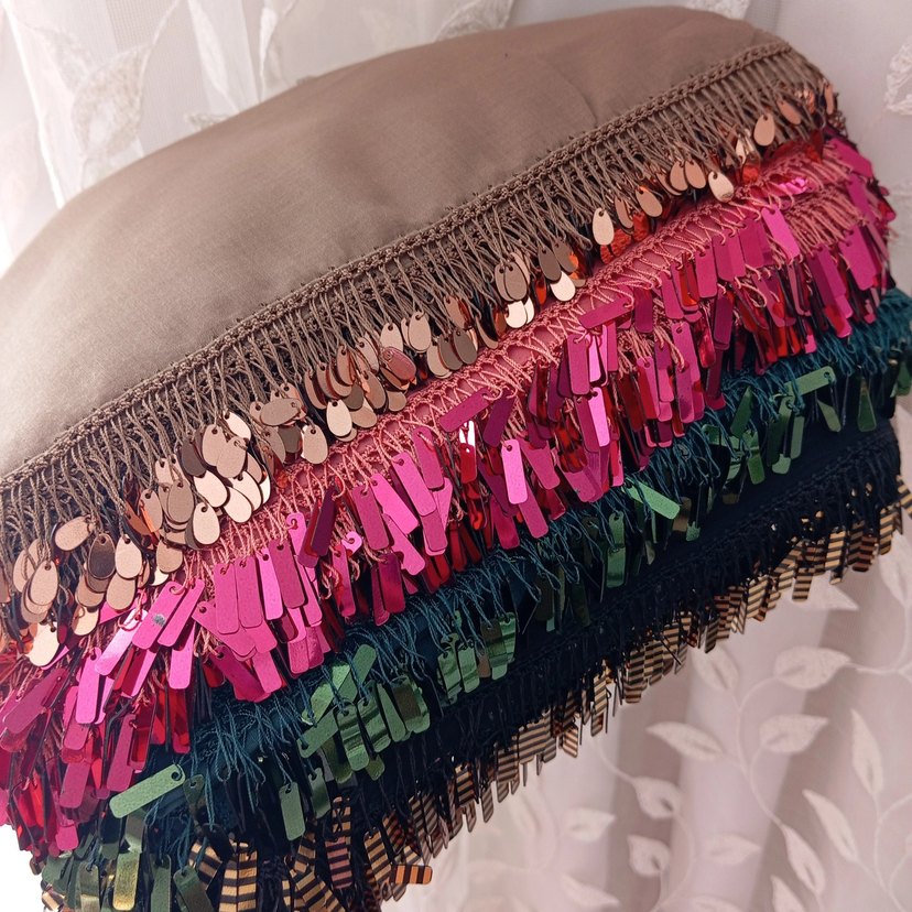 Bu kadın şalı, çok renkli koyu tonlarda tekstil ve püskül detaylarına sahip, bohem tarzını yansıtıyor. Hippie ve retro stillerle uyumludur.