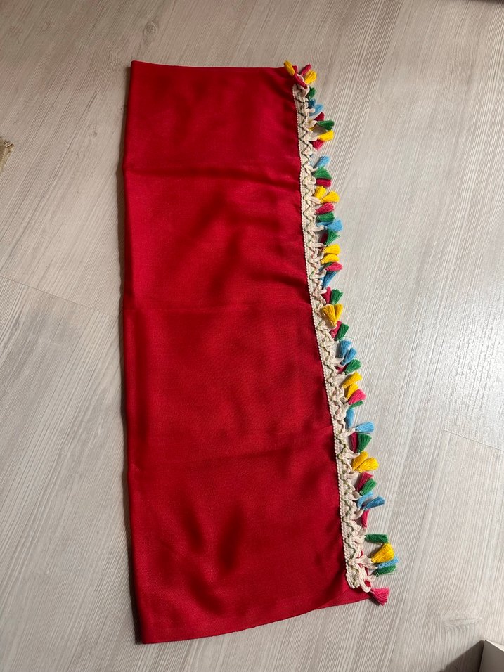 Yumuşak tekstil malzemeden yapılmış, bir kenarında renkli püsküller bulunan canlı kırmızı tabanlı kadın şalı. Bohem, hippie ve retro tarzlara uygundur.