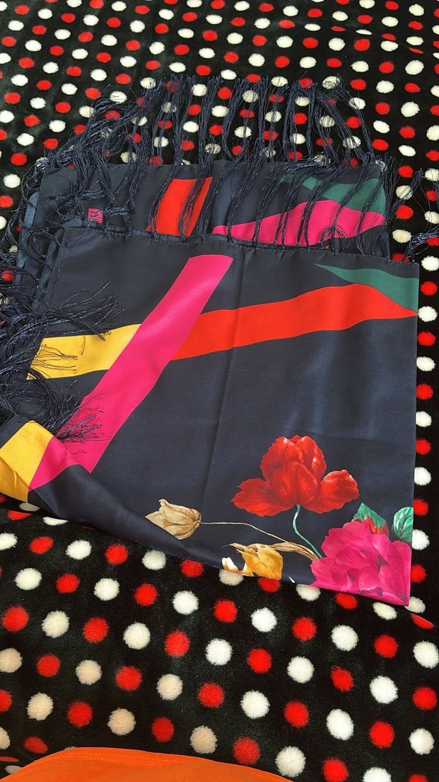Kadın şalı, çok renkli ve koyu tonlarda bohem desenli, püsküllü. Sentetik kumaştan yapılmıştır, retro hippie tarzını yansıtır.
