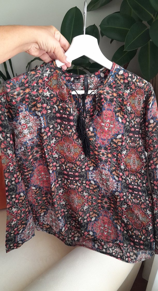 Hiç giyilmedi. XS diyor ama S belki ince yapılı biri için M. çok rahat bir bluz. Bir parça daha koyu görünüyor ve böyle daha şık aslında. fotoğrafı gün ışığında çektim. Bol kesim, uzun kollu ve yuvarlak yakalı bluz. Canlı çok renkli batik desenli, püskül detaylı, yumuşak dokulu kumaştan yapılmıştır.