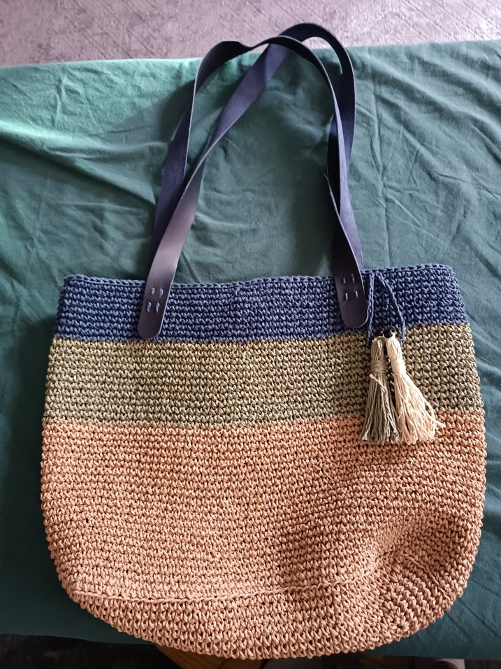 Kadın çanta, el örgü dokusu ve pastel çok renkli bantlara sahip. Püskül detayları ve deri saplarıyla bohem tarzda, günlük kullanım için uygun.