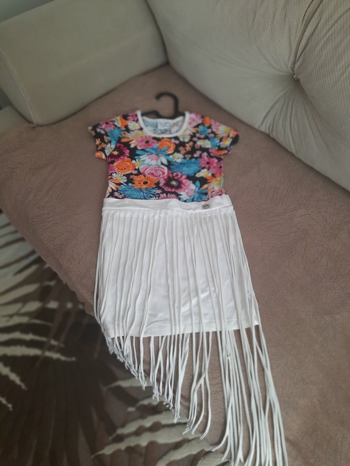 Çok renkli, kısa kollu ve yuvarlak yakalı kız çocuk elbisesi. Üst kısmı çiçek desenli, alt kısmı beyaz ve uzun püsküllerle bohem tarzda.
