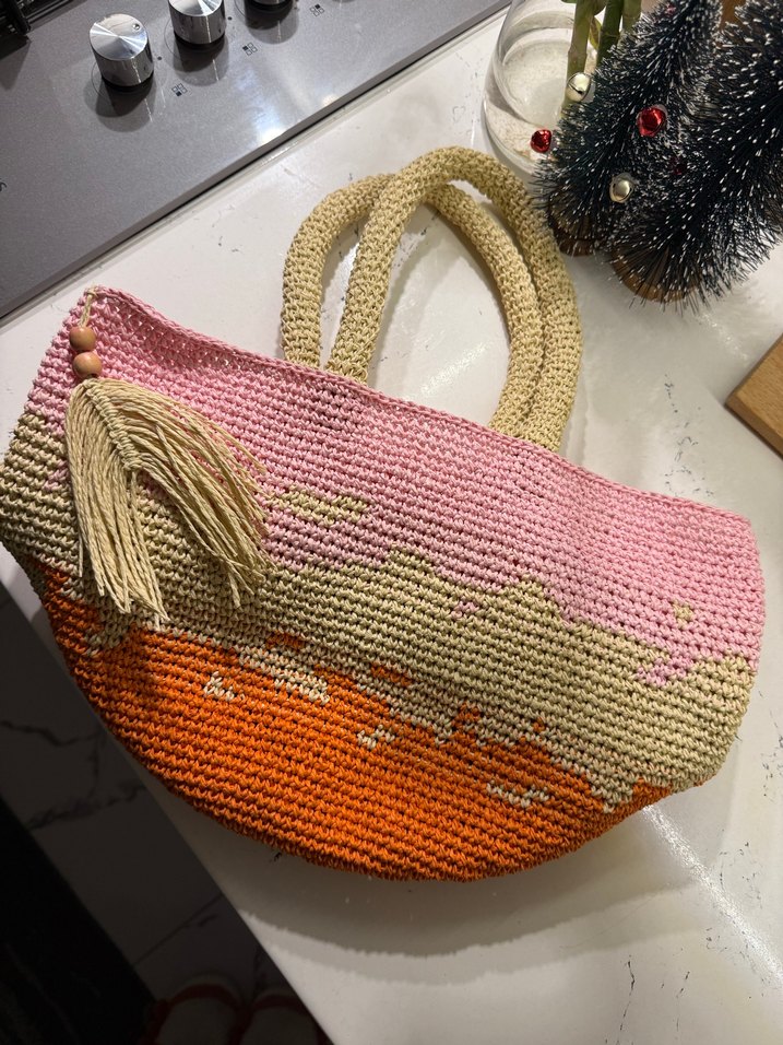 Püsküllü detaylı, pastel tonlarda çok renkli örgü kadın çanta. Günlük kullanım için uygundur.