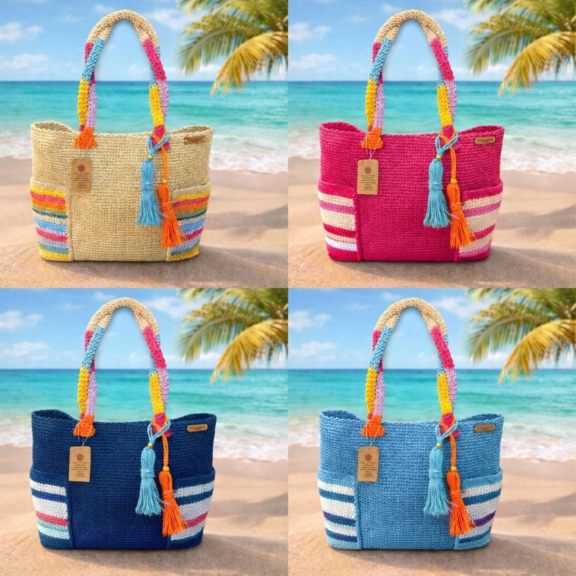 Püsküllü ve batik desenli, çok renkli örgü plaj çantasıdır. Bohem ve retro tarzıyla rahat saplara sahiptir.
