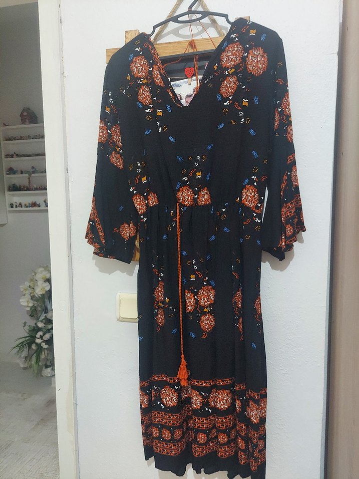 Uzun, bol kesim bohem elbise, uzun kollu, V yakalı ve çok renkli desenli kumaş ile püskül detaylarına sahiptir.