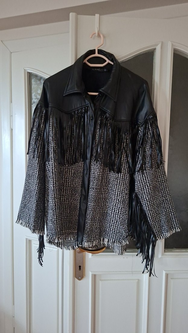 Uzun kollu, bol kesim kadın ceket, siyah deri ve gri yılan desenli kumaş karışımıdır. Püsküllü detaylarıyla bohem tarzı yansıtır. Günlük kullanıma uygundur.