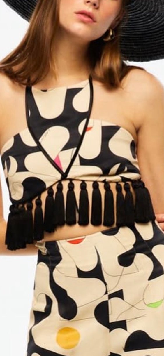 V yakalı, askılı ve vücuda oturan bu büstiyer, sentetik kumaştan yapılmış desenli tasarıma sahiptir. Etek kısmında püsküller bulunur. Mini boyu ve koyu çok renkli yapısıyla parti için uygundur.