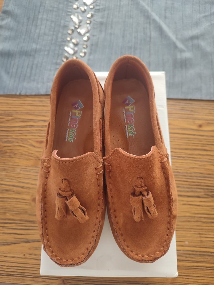 Püsküllü detaylara sahip kahverengi süet erkek çocuk loafer ayakkabı, renkli baskılı ve bohem tarzda. Rahat ve şık günlük kullanım için. Sadece birkaç kez giyildi..