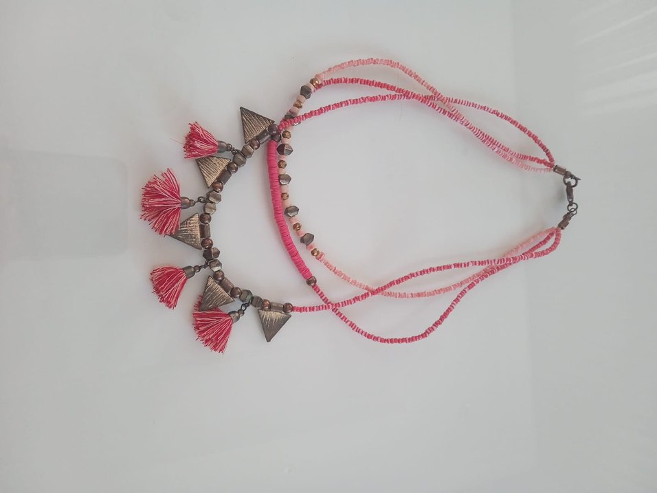 Uzun pembe bohem kolye, renkli etnik desenler ve püsküllerle günlük kullanıma uygun.