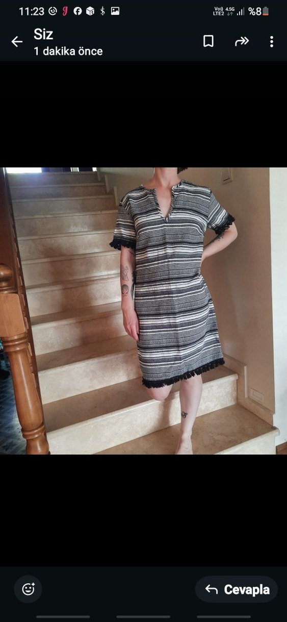 V yakalı, kısa kollu, çizgili ve püsküllü detaylara sahip bol kesim gri mini elbise. Bohem tarzda, günlük kullanıma uygun.