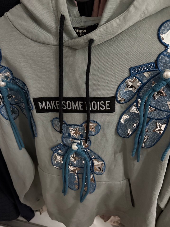 Püsküllü detaylara ve 'MAKE SOME NOISE' baskısına sahip gri denim kadın sweatshirt, sokak modasına uygun. Harika bir ürün