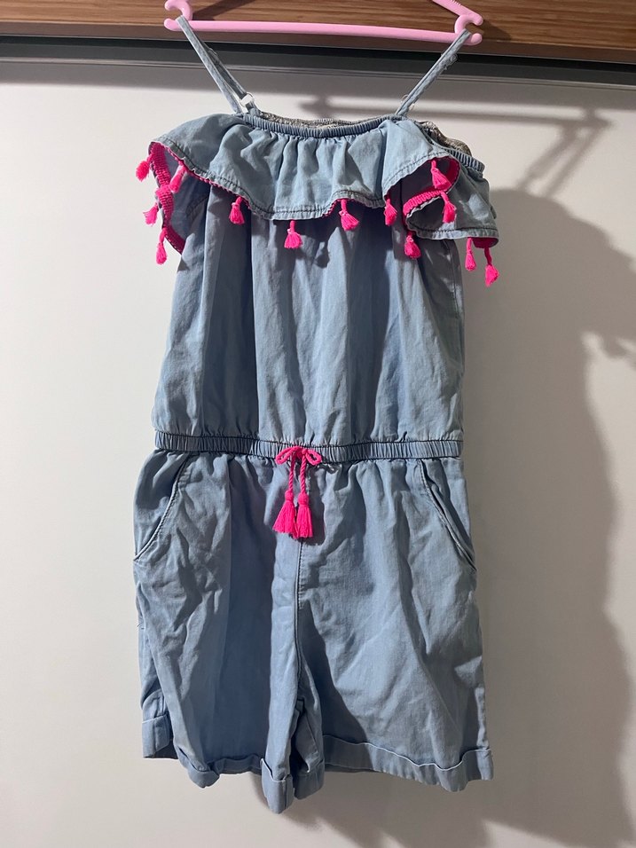 Gevşek kesim gri denim kız tulumu, askılı kollu ve pembe püskül detaylı, bohem tarzda ve batik desenlidir.