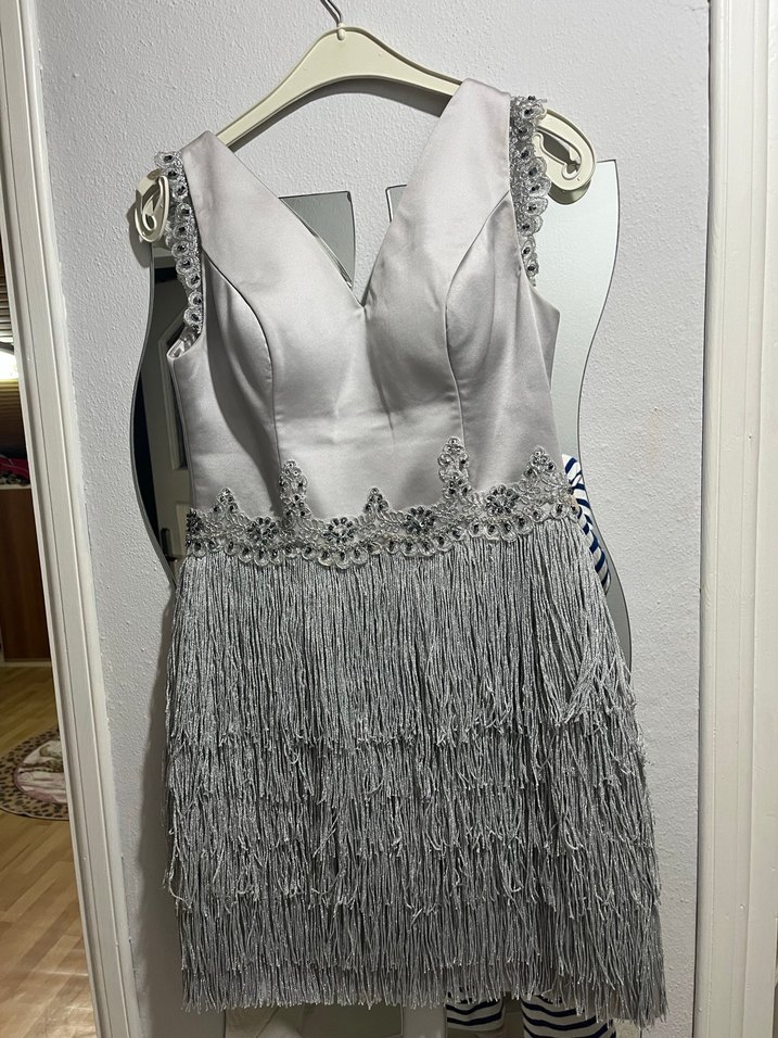Kolsuz, v yaka, işleme detaylı ve püsküllü gri mini abiye elbise. Düğün ve özel günler için şık bir seçenek. Özel dikimdir bir kere giyildi