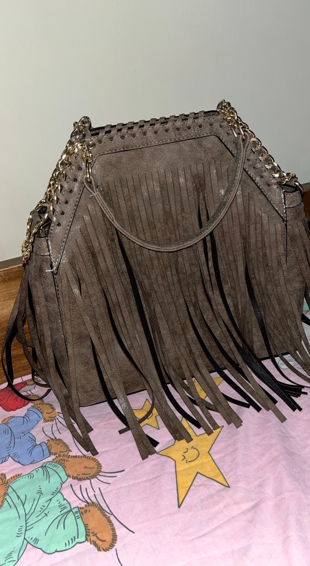 Gri süet malzemeden yapılmış, nakışlı ve uzun püsküllü bohem tarzda kadın çantasıdır. Günlük kullanım için uygundur. içerinde astar var görsele koydum ürünün arka kısmında çok küçük bir defo var belirttim