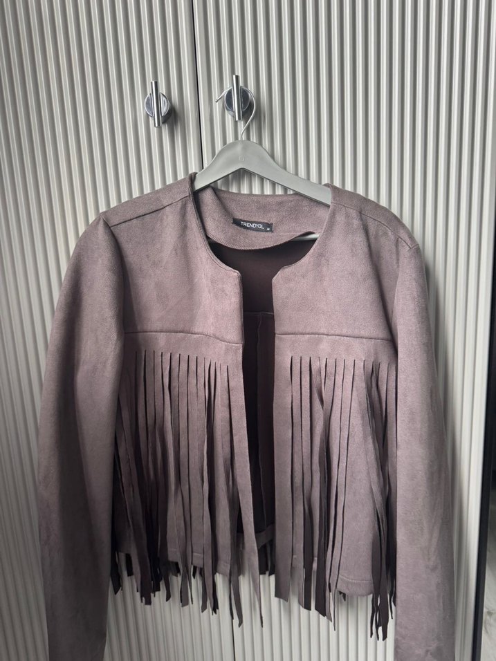 Yumuşak süetten yapılmış, uzun kollu ve bol kesim kadın ceket. Midi boyda, püsküllü detayları ve yakasız tasarımıyla günlük kullanıma uygun.